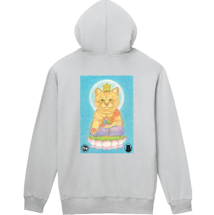 3つの猫仏画のうち、安楽寺にお越しくださる方みなさまにご挨拶をして、時にはお見送りもして人気の寺猫たびちゃん(虚空蔵菩薩様)の原画からパーカーに致しました!