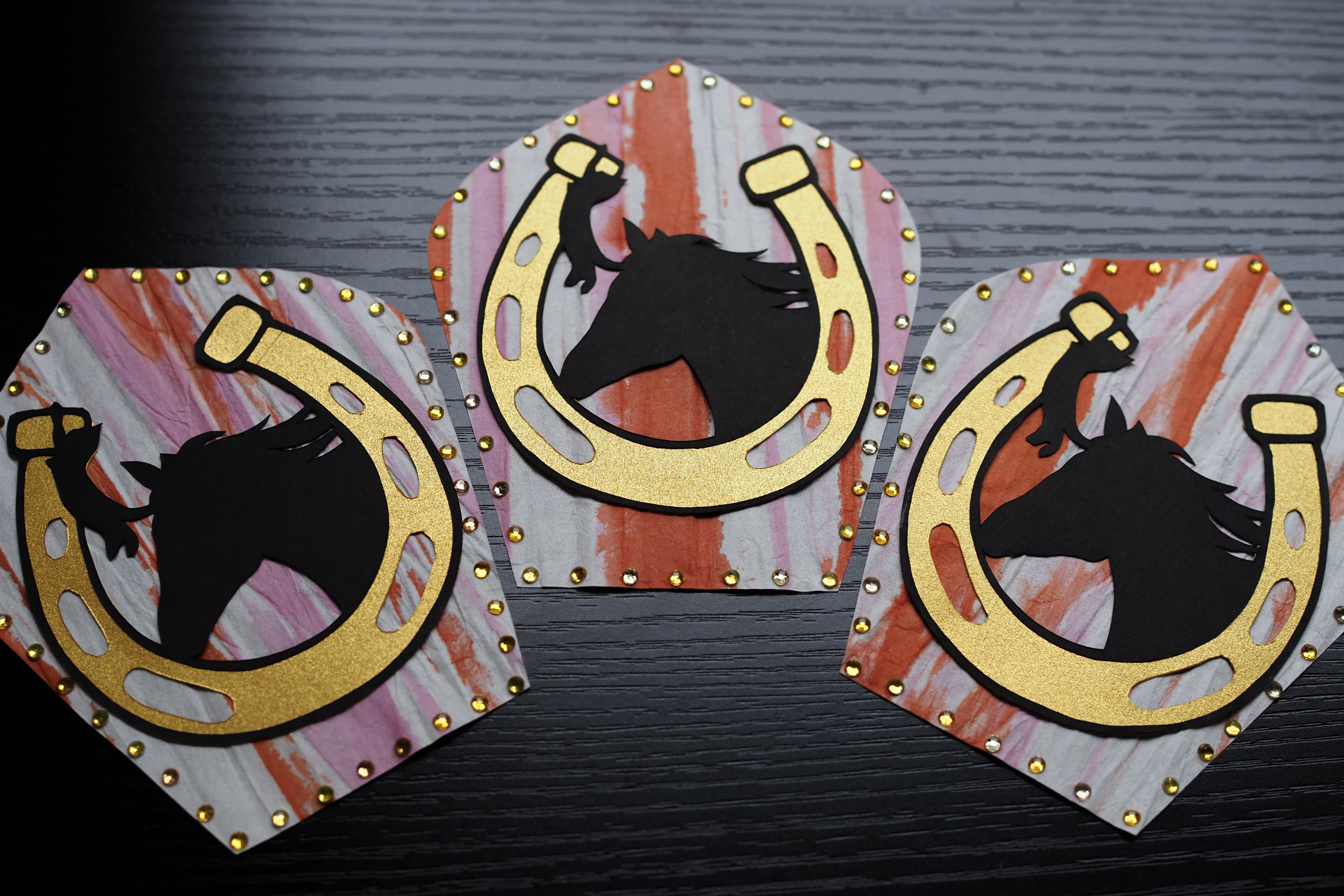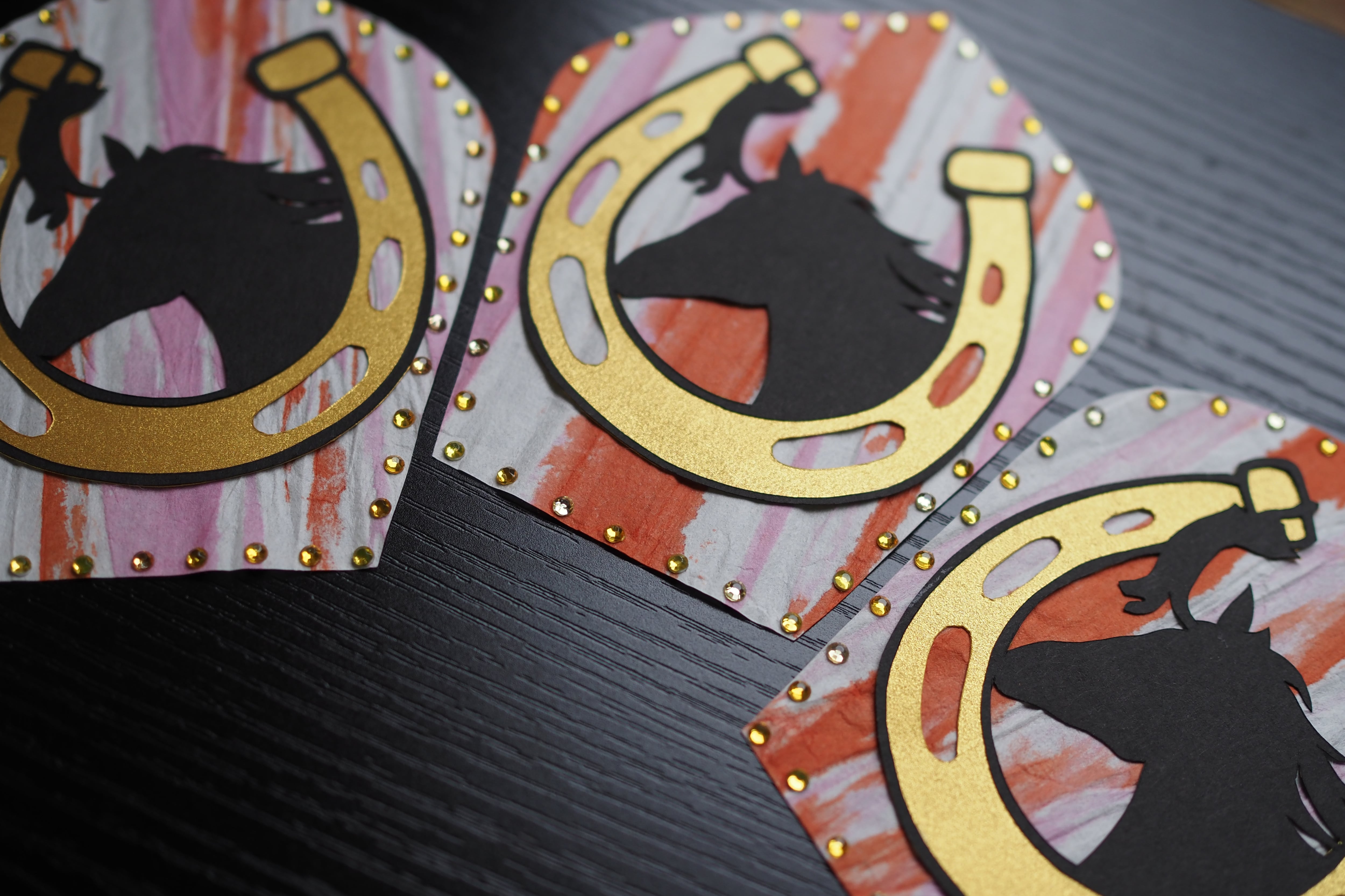 金色の馬蹄(ホースシュー)は「幸運を逃さずに受け止める」と言われるU字型。その中に力強い馬のシルエットと、よく見ると、猫ちゃんがぶら下がっています。