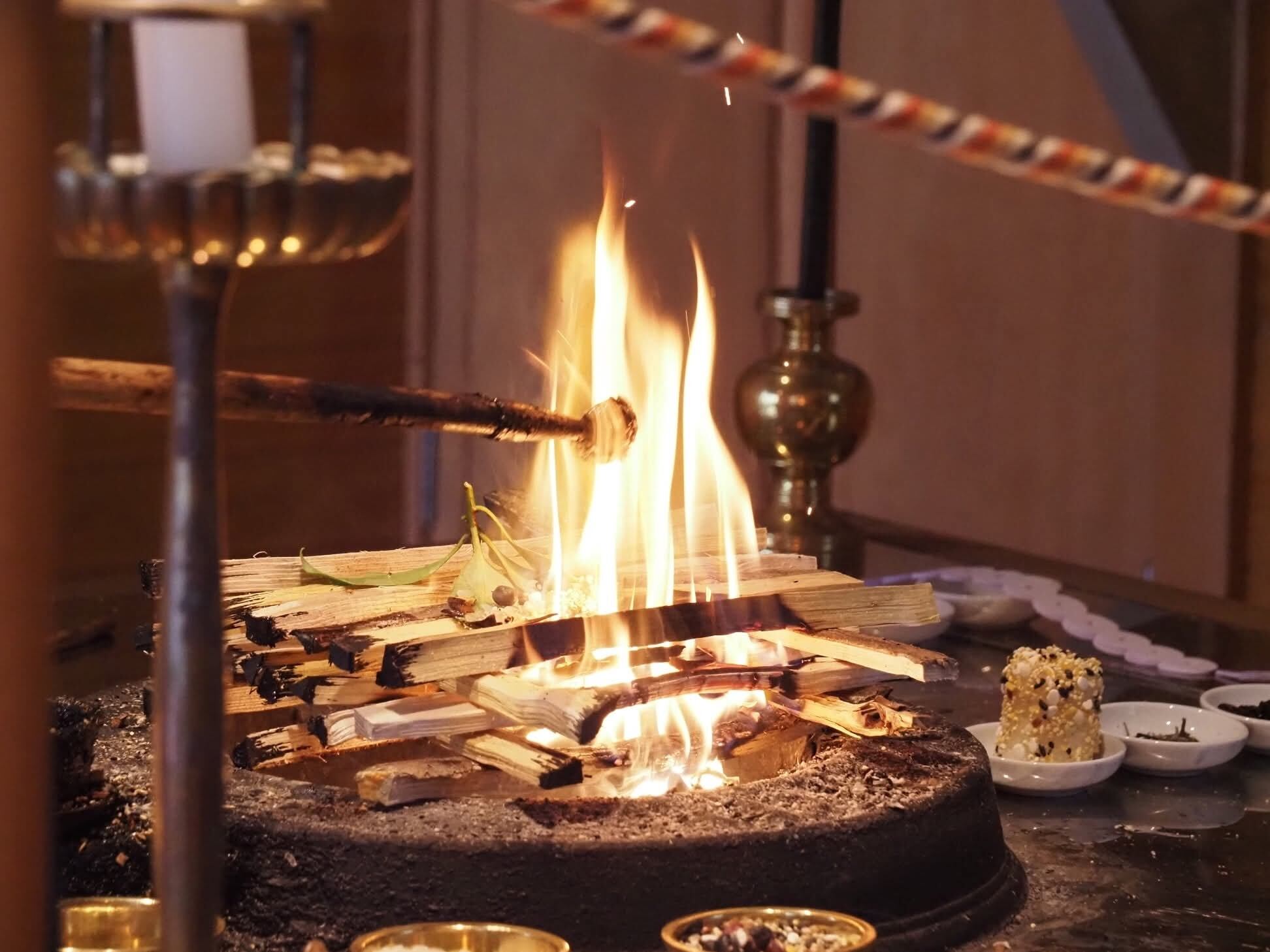 月例護摩祈祷(毎月28日)で、護摩の炎にかざして